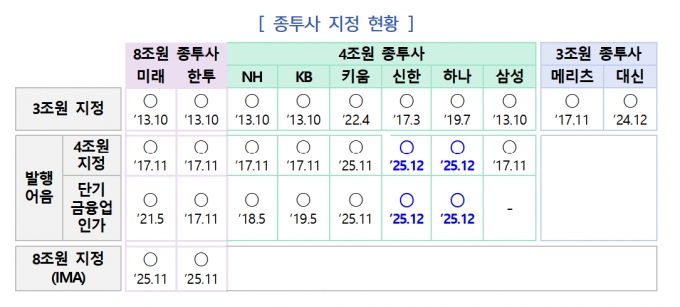 Ãß°¡ ÁöÁ¤À¸·Î ÀÎÇØ ´Ü±â±ÝÀ¶¾÷¹« ¿µÀ§°¡ °¡´ÉÇÑ Á¾ÇÕ±ÝÀ¶ÅõÀÚ»ç¾÷ÀÚ´Â ¸ðµÎ 7°³»ç°¡ µÆ´Ù. Çѱ¹ÅõÀÚÁõ±Ç¡¤¹Ì·¡¿¡¼ÂÁõ±Ç¡¤NHÅõÀÚÁõ±Ç¡¤KBÁõ±Ç¡¤Å°¿òÁõ±Ç µîÀÌ ¾Õ¼­ Àΰ¡¸¦ ¹Þ¾Ò´Ù. ÇöÀç ±ÝÀ¶´ç±¹Àº ÀÚ±âÀÚº» 8Á¶¿ø ÀÌ»ó Á¾Åõ»çÀÇ NHÅõÀÚÁõ±ÇÀÇ Á¾ÇÕÅõÀÚ°èÁÂ(IMA) »ç¾÷ÀÚ ÁöÁ¤°ú 4Á¶¿ø ÀÌ»ó »ï¼ºÁõ±Ç¡¤¸Þ¸®Ã÷Áõ±ÇÀÇ ¹ßÇà¾îÀ½ »ç¾÷ Àΰ¡ ½ÉÀÇ ÀýÂ÷¸¦ ÁøÇà ÁßÀÌ´Ù.